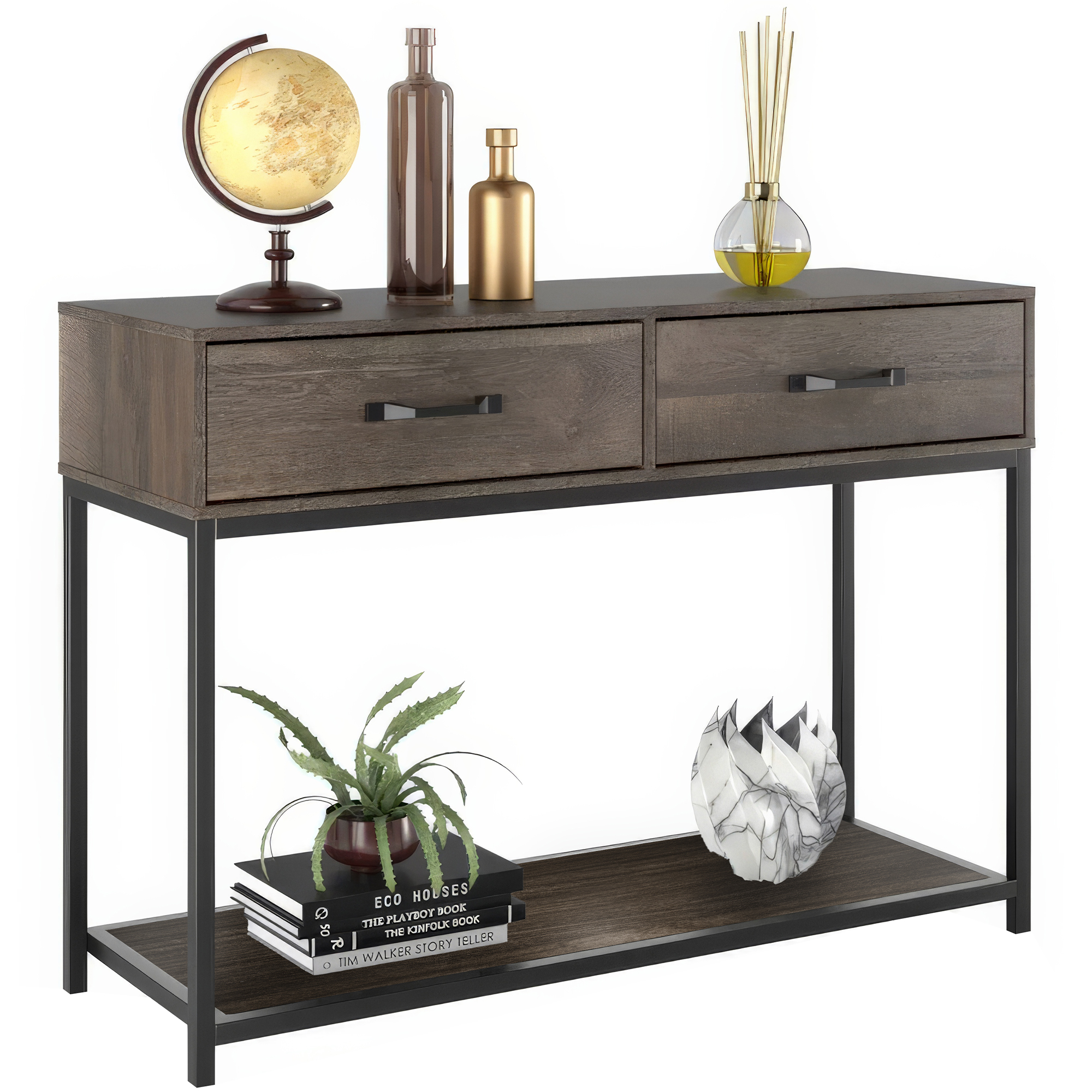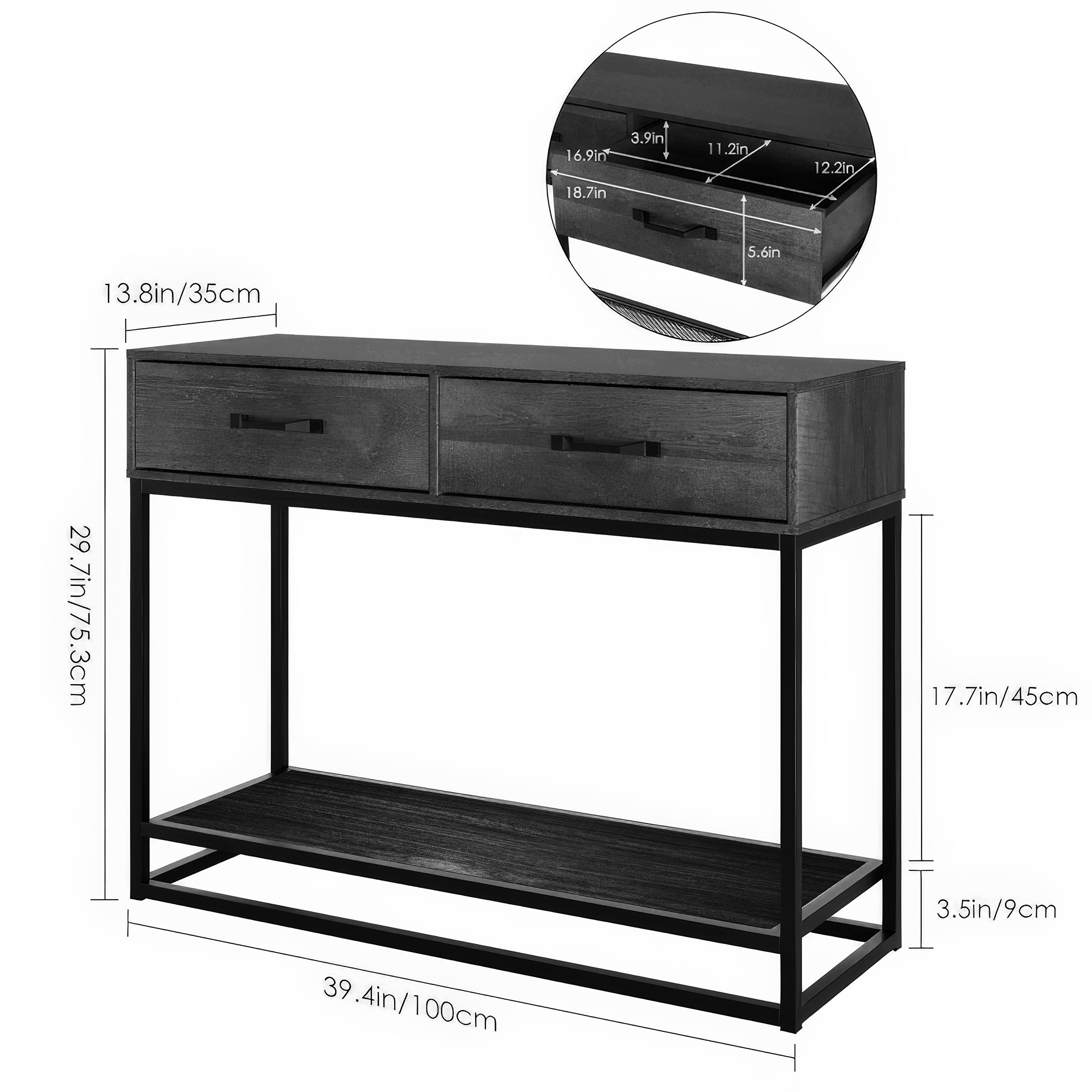- Two drawers and a large open shelf for storage and display
