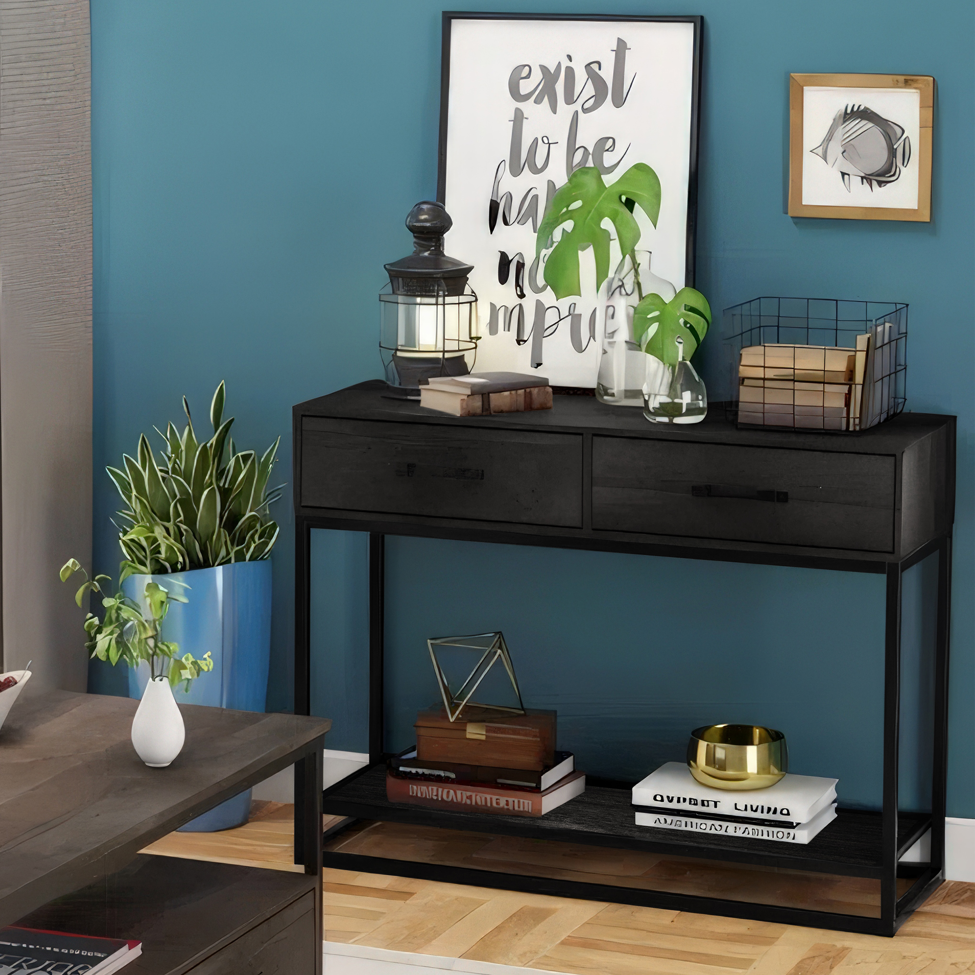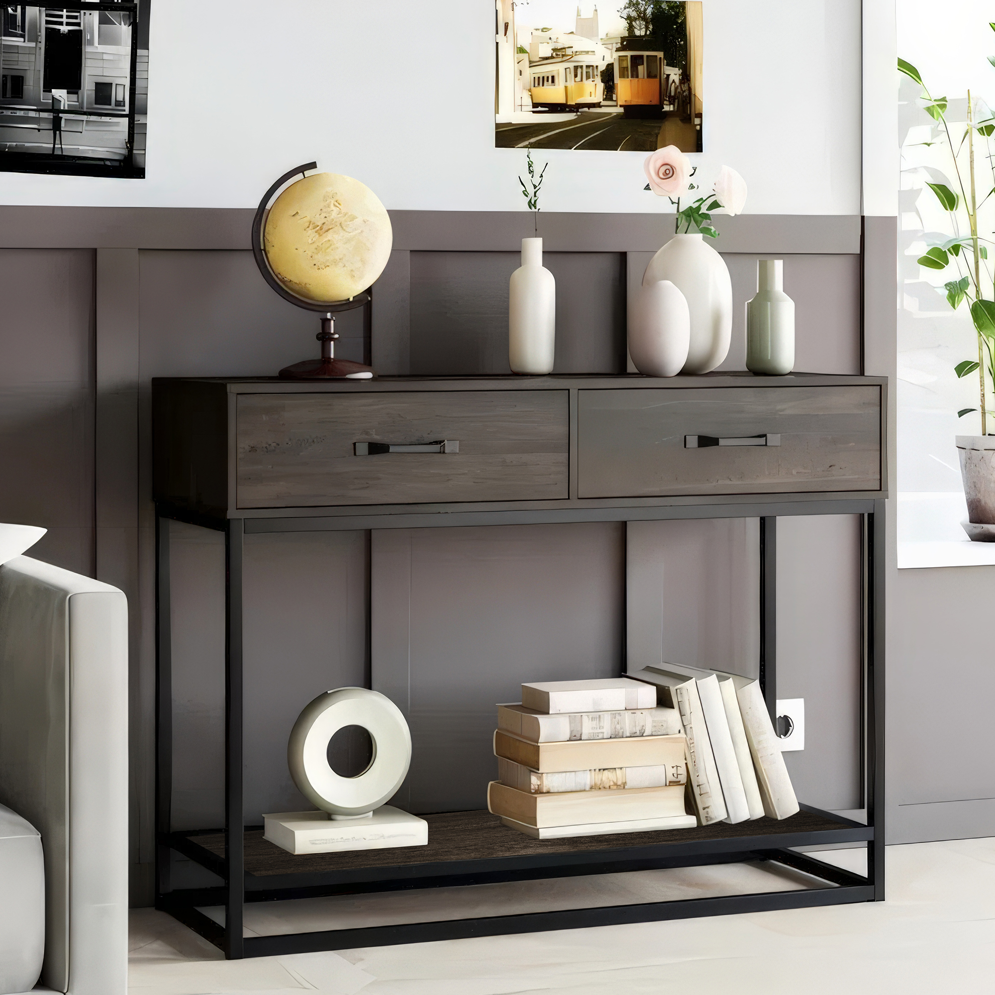 - Industrial design with black metal and rustic wood tones
